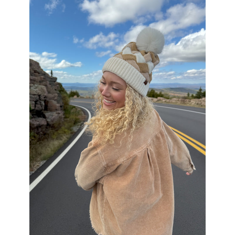 Color Block Knitted Sherpa Pom Beanie HAT2069