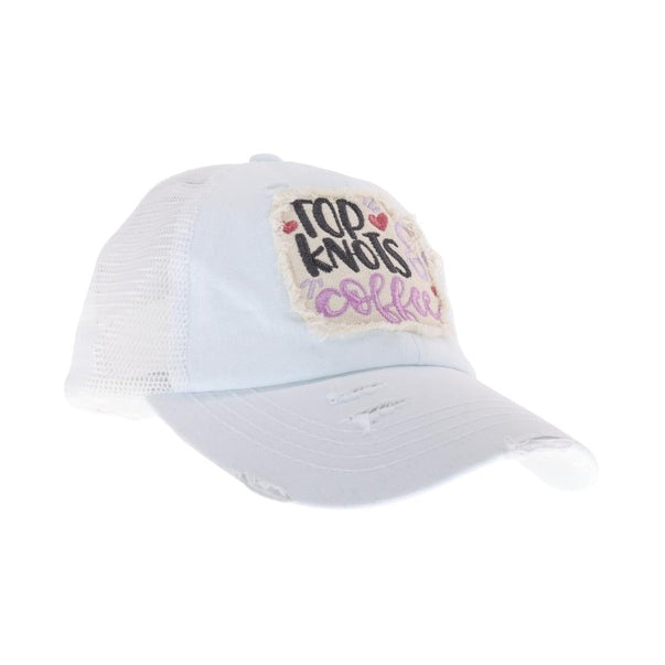 NEW NEW NEW! This high pony ball cap shows off a cute patch to do the talking for you! Distressed and on one of our best selling body styles - grab yours before they sell out!
