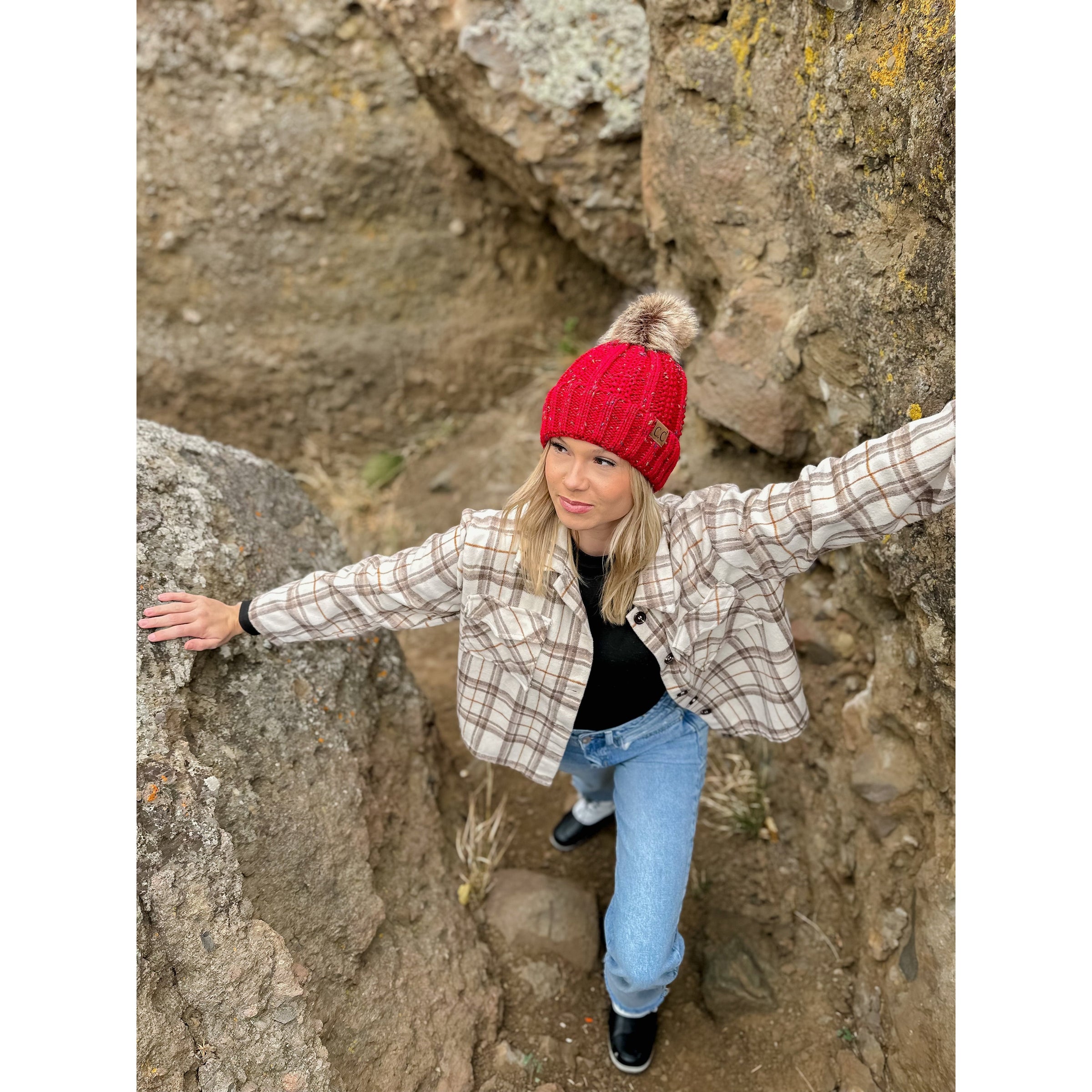 This very popular fuzzy lined fur pom beanie now comes in a flecked color mix! This popular knit of this hat along with a popular fur pom and warm lining will make this a great addition to your beanie collection!