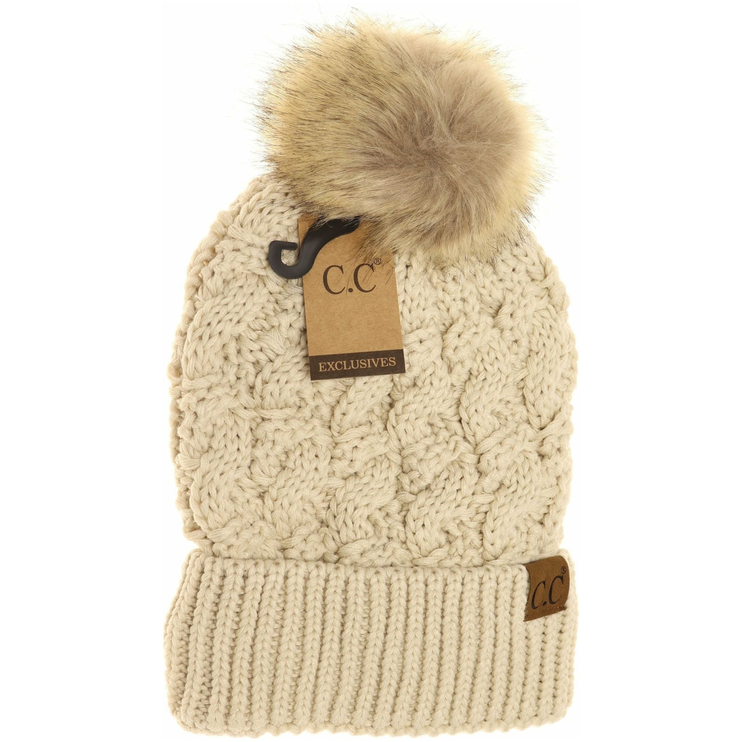 Ribbed Cable Knit Fur Pom Beanie YJ2021