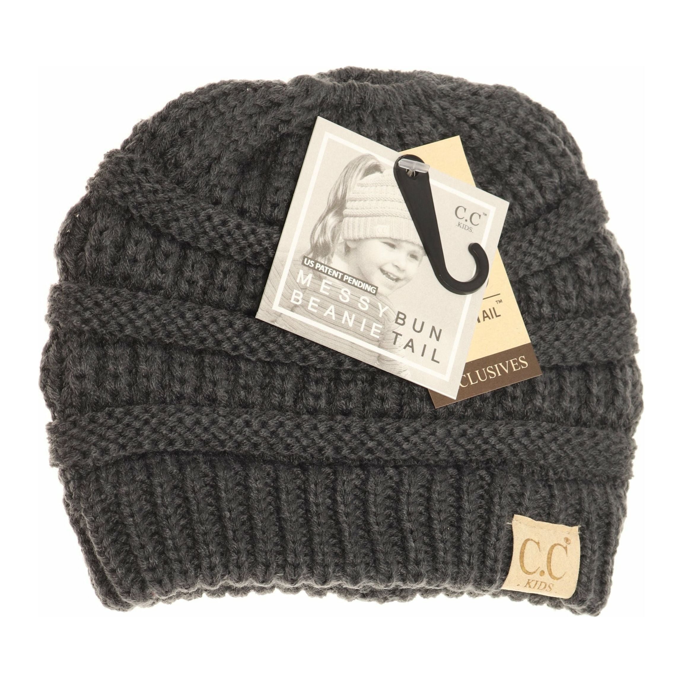 The much anticipated arrival of a "messy bun" CC beanie is here for kids! This CC beanie tail beanie allows your little one to wear her favorite head gear on a cold day, but pull her hair up!  It features an elastic opening in the middle to keep the beanie in place without slipping and is great for kids at play!  Get yours while supplies last at this INTRODUCTORY price!