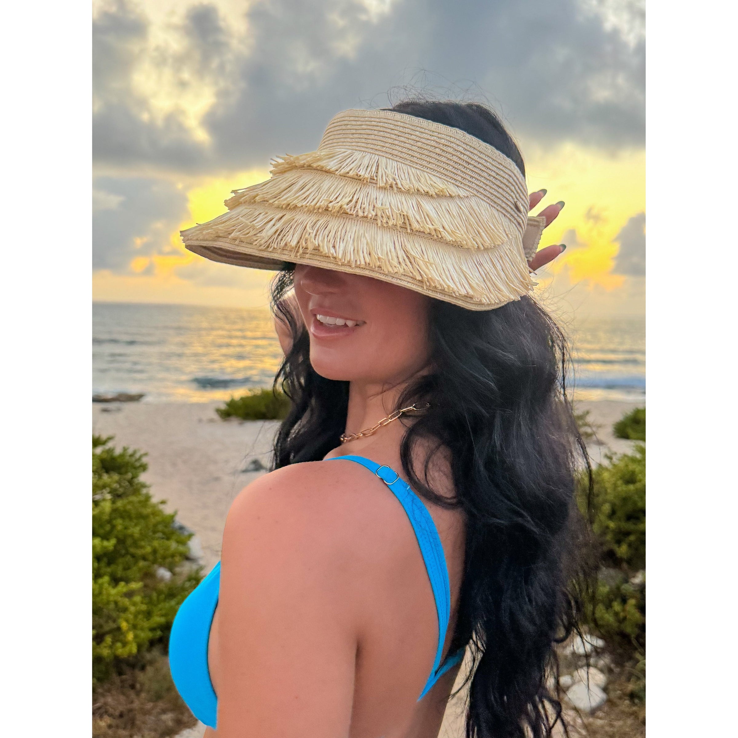Stay cool and stylish on your next vacation with the Fringe C.C Sun Visor! This adjustable visor adds a playful touch with its fringe design, perfect for those sunny summer days. Stay ahead of the fashion game and keep the sun at bay. (Vacation vibes included!)
