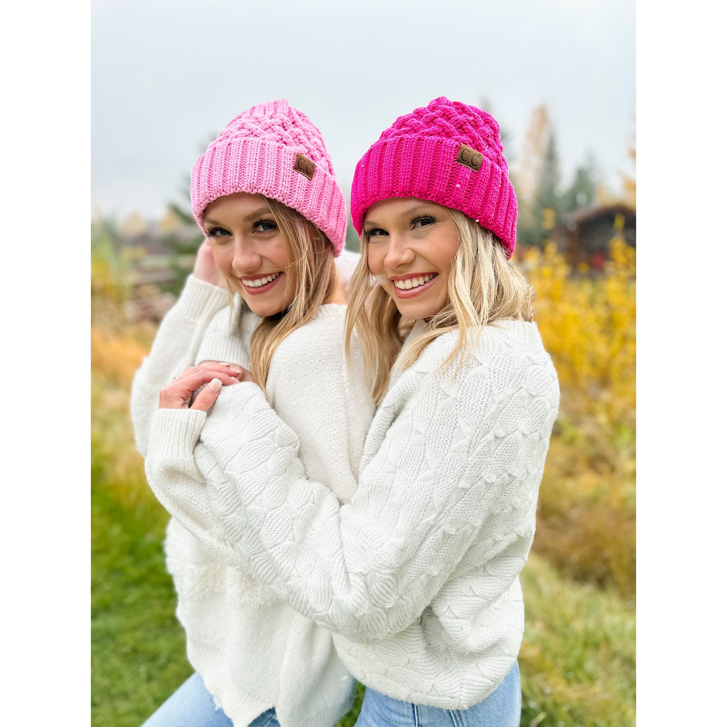 A gorgeous lattice knit pattern on this cuffed beanie - available in trending rich tones!