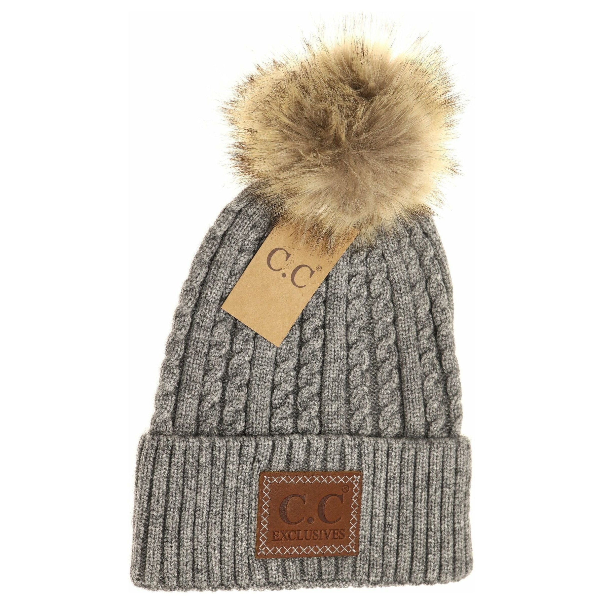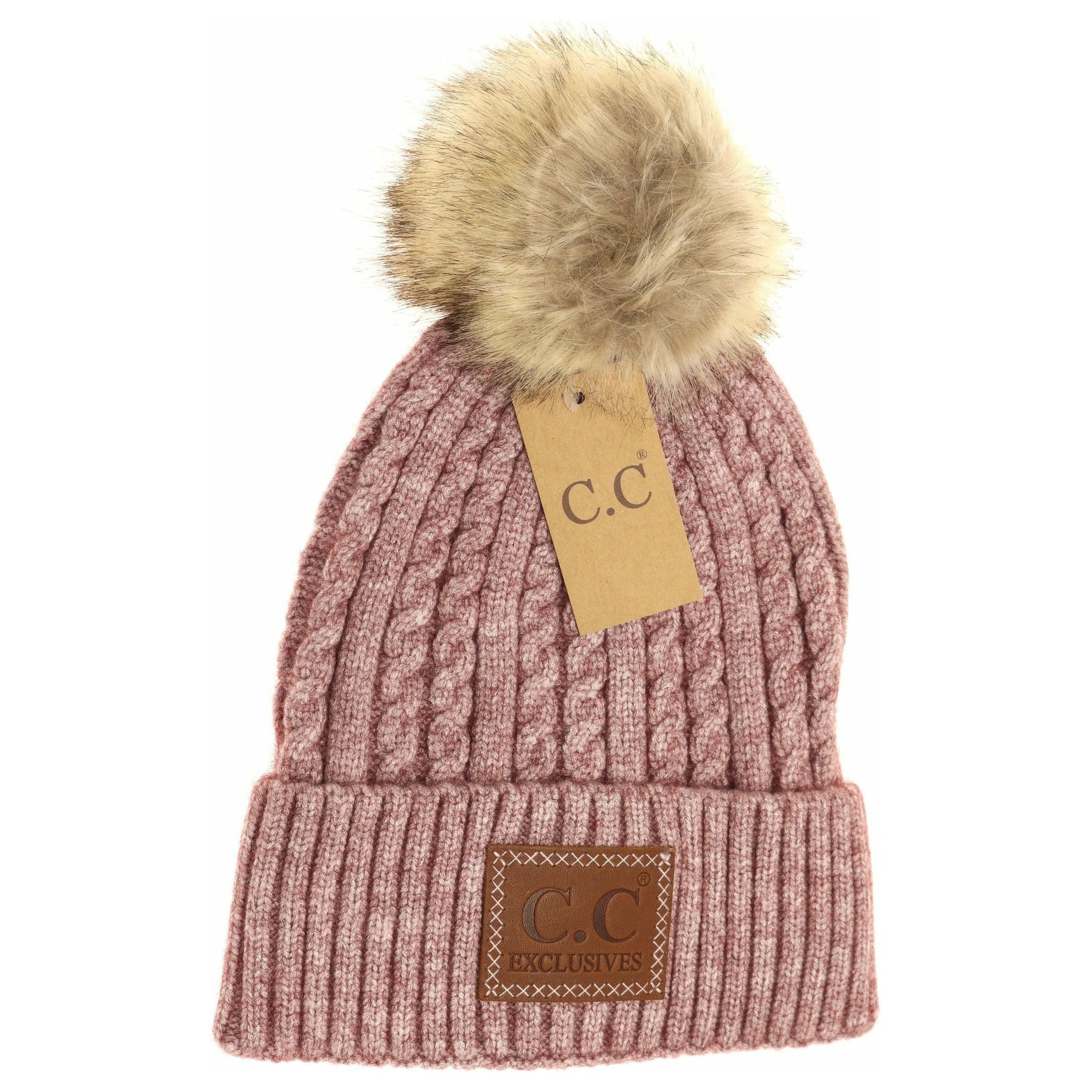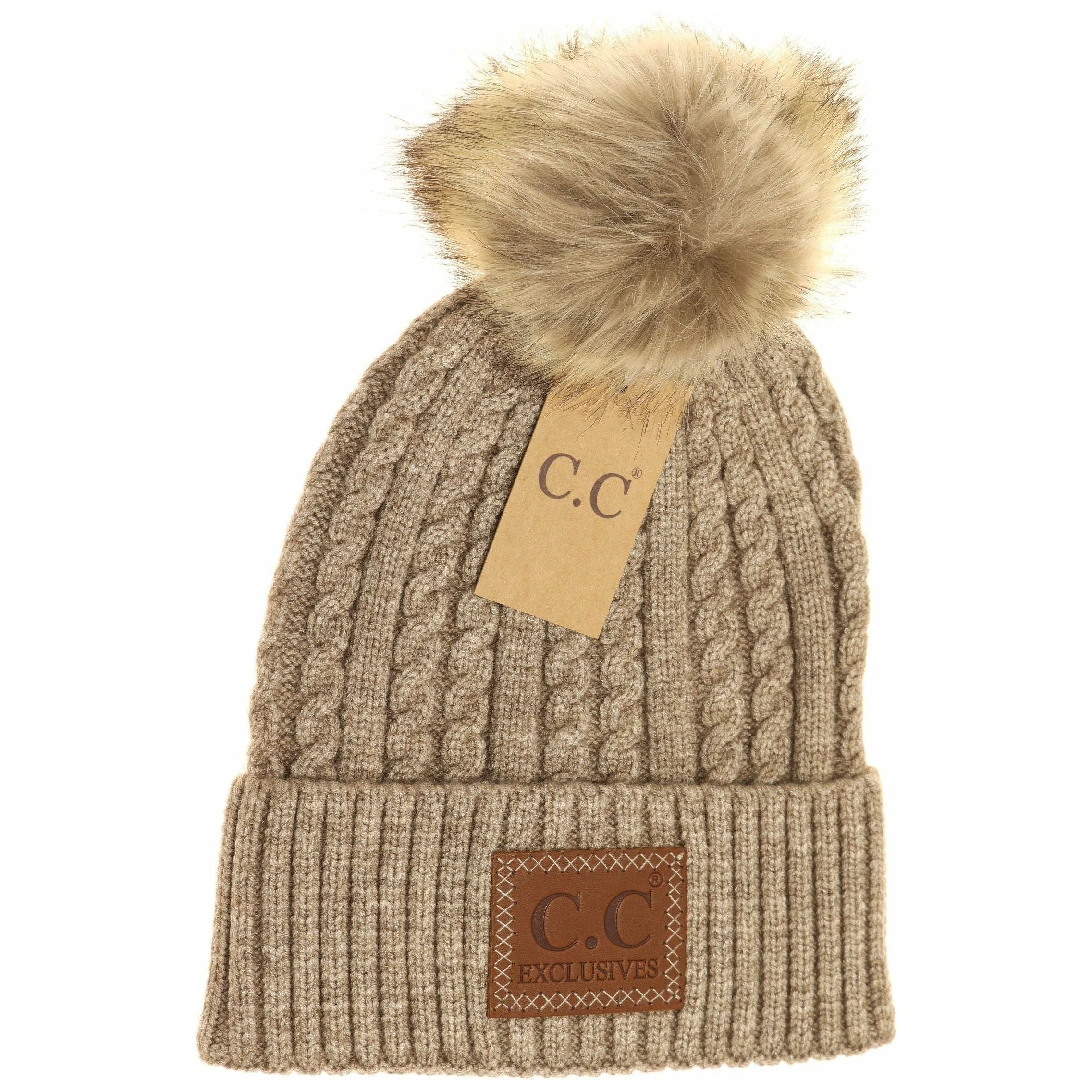 Double Braided Knit Faux Fur Pom Beanie HAT3478