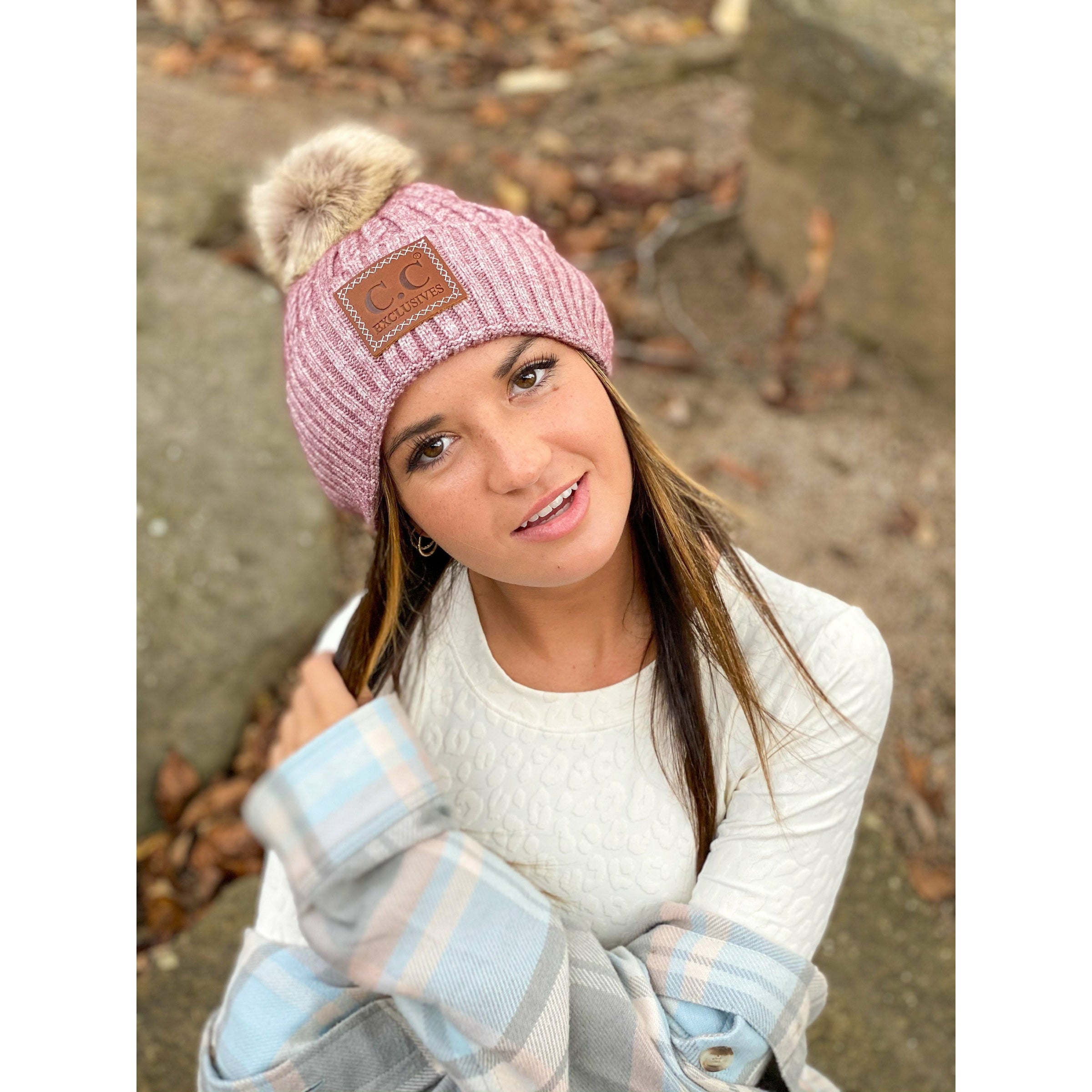 All NEW! We are loving this large patch logo, and we are sure you will too on this double braided knit beanie with a faux fur pom! It is soft and adorable.