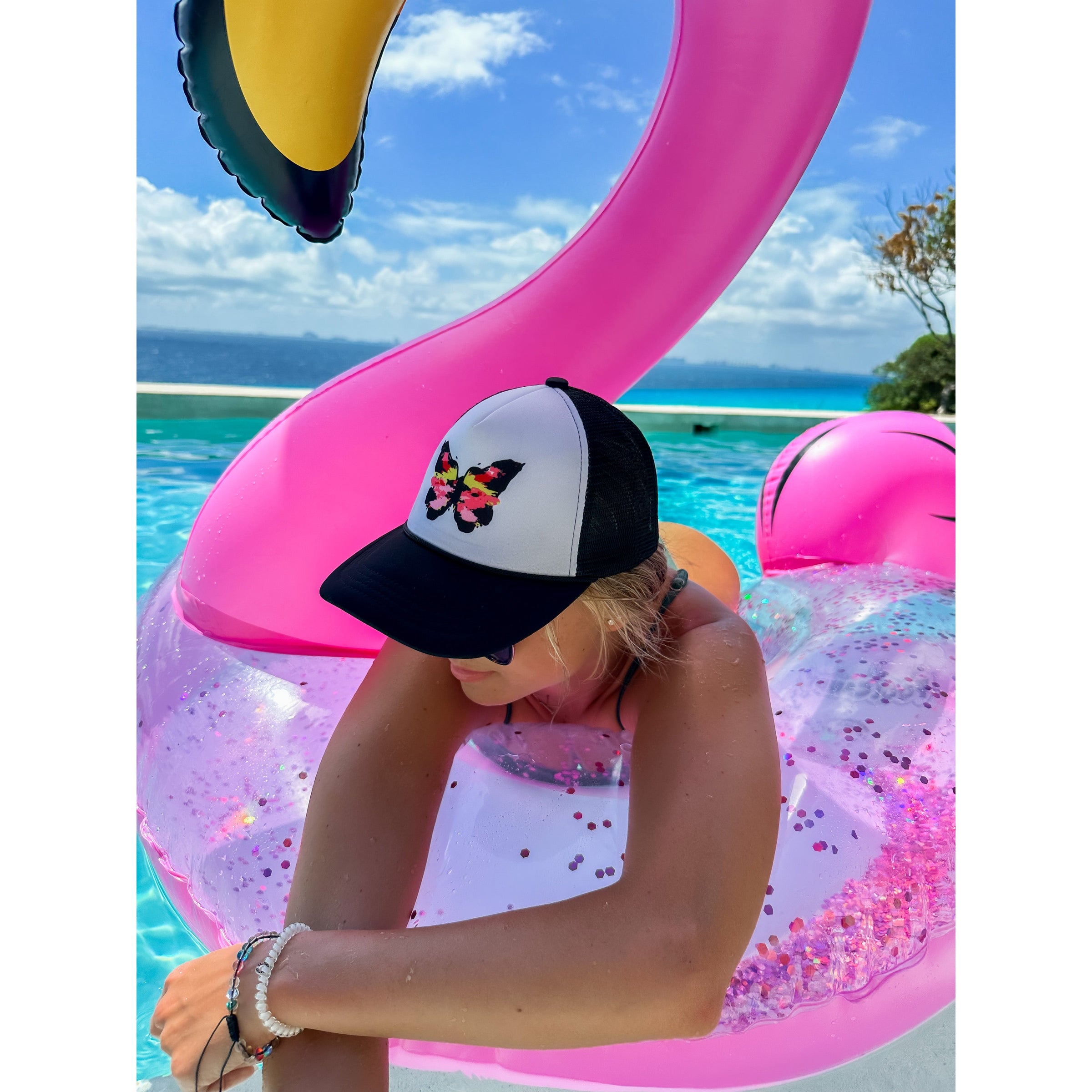 Add a pop of color to any outfit with our hand painted butterfly trucker hat. The sunset color palette is perfect for any occasion. Stand out with the Bright Abstract Butterfly C.C Trucker Ball Cap GBA01.